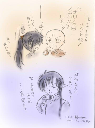 夜2組での雑談と、ハウンドソロシーンより、らくがき。 ハウンドは可愛いですね^^ 戦闘で毎回のように気絶するし、器用貧乏だし、 過去のことになると妙にヘタレだし、本当に愛おしいです^^ さくらさんのイラストがまた超好みですw ハウンドはとりあえず「後ろ」です^^ フェリ・ハウンドもサイモン・ハウンドも大好物でs・・・(黙れ |